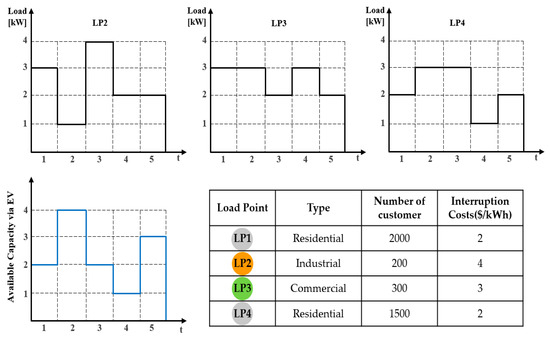 Figure 2 shows the arrival time of the EV for each load in an arbitrary system by modeling with a TSN. Arrival time is on the vertical axis and node scale is on the horizontal axis. The TSN consists of nodes, marked in black, and arcs to represent driving and parking. Arcs are divided into EV driving arc and EV parking arc. If the EV arrival time between each node is equal to the number on the left side of Figure 2, each arc can be represented as shown on the right side of Figure 2. Here, if the allowable EV arrival time ζ a is selected within 2 time intervals, the driving arc departing from LP1 is excluded from the EV available capacity calculation because the arrival time is longer than ζ a . Therefore, it is possible to model the actual EV driving arc (marked in red) and the EV parking arc (marked in blue) in LP2, thereby calculating the available EV capacity in LP2.