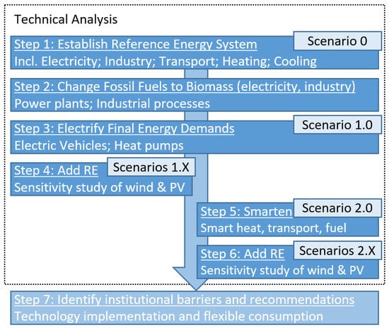 This section introduces the methods and underlying procedures for the conducted analysis as well as the used data, which can be found in the Supplementary Material Section. This includes the use and creation of scenarios, details of the case study and the required steps to reach 100% RE systems in the technical analysis. A simplified overview of the steps and corresponding scenarios explained in Section 2.1 is illustrated in Figure 1. The modeling software EnergyPLAN that is used for these is introduced in Section 2.2. The final consequential step after the technical analysis is presented in the market analysis in Section 2.3 to support the scenarios.