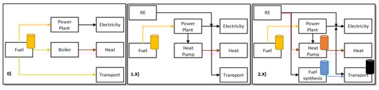 EnergyPLAN has been applied in multiple studies of national [37,38], regional [39,40] and island energy system perspectives [20,21]. With various combination options of supply, conversion and storage technologies (cf. flow diagrams, [36]), the energy system model can be set up as required, which results in Figure 2. Mathiesen et al. [41] present the energy flow diagrams for various technical simulations, presenting similar steps in the transition to 100% RE. These can be modeled in EnergyPLAN and adapted to illustrate the current technical analyses and may further be related to the institutional analyses. In Figure 2, the energy flow diagrams represent Scenario 0 as a traditional energy system with no apparent cross-sector interaction, and the two following flow diagrams illustrate the two approaches of Scenarios 1.X and 2.X. The 1.X diagram shows the addition of RE and electrification of transport and heating and 2.X shows the addition of V2G, solar thermal, hydrogen production and various storage options.