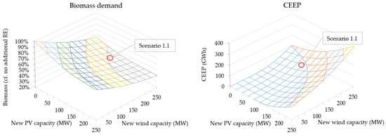 Based on [32], the sensitivity study allowed for evaluating the impact of fluctuations of certain parameters on the outcome in a system, such as the energy system model. In the context of this study, the parameters were additional PV and wind capacity to minimize uncertainty of their contribution to the sustainability of the energy system. The capacities varied between 0 and 250 MW in eleven steps of additional capacity each, presented in 3D surface diagrams of 121 possible combinations. Besides the scenario targets in biomass, CEEP and costs, the following key performance indicators (KPIs) were added to evaluate the results of the sensitivity studies and complete the sociotechnical analysis: RE share of primary energy supply (PES) and electricity supply, sustainable share (not including biomass-based electricity) of electricity, CO2 emissions, total and peak electricity demand.