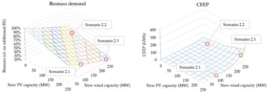 Step 5 resulted in Scenario 2.0, which is similar to Scenario 1.0 but slightly more expensive due to its complexity. The following sensitivity study in Step 6 therefore was required to show its full potential. Step 6 addresses the same target points as Step 4 to increase sustainability shares through reduced biomass amounts, costs and CEEP. In contrast to Step 4, where only one scenario fulfills the targets, the SES approach offered 41 possible options within the same criteria. The following proposed scenarios therefore could further address potential limitations in available land and visual impacts if required. Scenarios 2.1 and 2.2 thus demonstrated mainly PV or wind, respectively, while Scenario 2.3 did not consider any of these limitations. The results of this sensitivity study can be found in Figure 4, which shows that biomass reduction potential spanned longer than in the electrification scenario (1.X) with up to 77% biomass reduction at full additional capacities of 250 MW each. Furthermore, CEEP can be avoided in 72 out of 121 possible combinations and remained below 100 GWh in all but three options.
