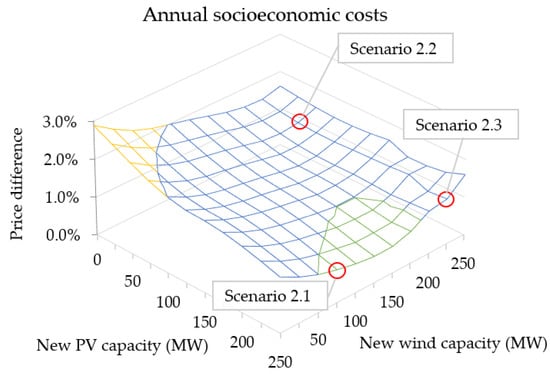 Alternatively, if none of the above presented scenarios appears optimal after all, a compromise or combination of their aspects could be considered. For example, if suitable land for wind turbines are limited but should still be included, other scenarios could be further evaluated with Figure 4 and Figure 5. Regarding biomass reduction, 15 combinations require <1000 GWh biomass; and regarding CEEP increase, 72 combinations are at <0.1 GWh CEEP and another 27 within 0.1–25 GWh CEEP. Finally, the target criteria of cost limitation are presented in Figure 5, where the socioeconomic cost development of the scenario is illustrated in comparison to Scenario 1.1. In contrast to the biomass consumption and CEEP, it did not develop linearly but shows the optimal scenarios at PV capacities above 175 MW and wind capacities between 50 and 175 MW. Regarding annual socioeconomic costs, Scenario 2.1 would be the most secure in this regard, but further 11 other combinations would be as well.