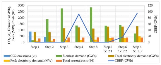 Complementary to Table 1, Figure 6 illustrates selected KPIs. While CO2 emissions dropped drastically within the first two steps, biomass consumption increased until RE was added. Still, electricity demands were increasing with each step, similarly to the costs. While electricity demands increased by 57–350%, the costs increased by only 24.5% compared to Step 1. When including the additional CEEP values, the dependency between all KPIs is shown.