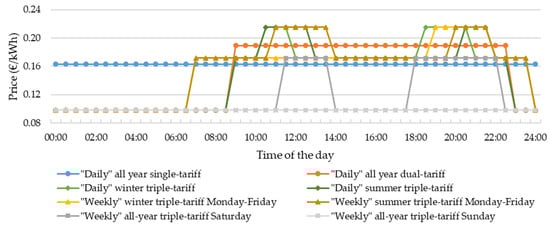 On the other hand, incentives for flexible consumption are in theory available for all sectors, yet with a limited reach so far. The local transmission system operator (TSO)/distribution system operator (DSO; EEM) together with the national energy services regulation entity (ERSE) introduced time-of-use tariffs to address the local issue of high electricity demand peaks during the hours 9:00–13:00 and 18:00–22:00. The result was an optional choice between three main tariffs, which only change according to season (summer and winter season) and potentially weekdays (Monday–Friday, Saturday and Sunday), see Figure 7. According to EEM, the idea is to incentivize consumers to use electricity during the night, as this is when curtailment—or in the technical analysis CEEP—most likely occurs [43].