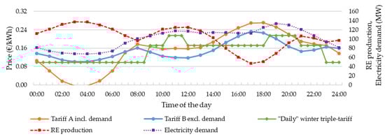 Semi-flexible electricity prices have been introduced to regulate the demand and encourage consumption outside peak hours through optional tariffs, but this is not yet widely done and must be adapted to a 100% RE system and to the sensitive energy systems of islands. However, the currently used time-of-use tariffs are not suitable for high RE scenarios and more flexible tariffs are suggested to overcome the existing barriers by including equality and transparency for the consumers [48]. In comparison with Figure 7, Figure 8 indicates a potential price mechanism according to RE production, with the option to take the electricity demand (projection) into account. Similar average daily prices of 0.15 €/kWh are compared to the current tariffs, but with more extreme peaks, incentivizing dynamic consumption. This is shown in an example for 7th January, where consumption is encouraged during the windy night (and low demand), instead of the early evening, where ceasing PV and wind production (and high demand) increase the price between 15:00 and 20:00 drastically (cf. triple-tariff).