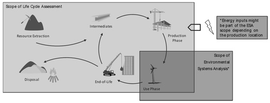 The perspective of life cycle thinking enables LCA to cover the total environmental impacts associated with the product (e.g., energy system technology). The system boundaries focus on the product life cycle and are mostly indifferent to political entities. Geographical differences can be accounted for in the background data [41]. Thus, the methodology of LCA follows a consumer pays principle as it allows producing consumption-based footprints [41,42]. While LCA is standardised in ISO 14,040 and 140,444 [40,43], there is no such thing as a standard LCA as the goal and scope is always dependent on the requirements and the purpose of the study. The term standard LCA will here be used to describe LCA studies that are not adopted to be used in ESA and thus covering the whole life cycle. The main advantages and reasons why LCA is established as an important sustainability assessment tool are the capability to quantify burden shifting and to identify trade-offs by covering a wide range of impact categories [44].