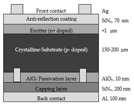 The global PV market is currently dominated by Silicon (Si)-based solar cells. Among various cell concepts, the global market by the end of 2018 was dominated by Aluminium-Back Surface Contact (Al-BSF) cells, with 60% of the market share, followed by a share of 35% for Passivated Emitter and Rear Cells (PERC). However, based on the prediction of the International Technology Roadmap for Photovoltaic (ITRPV) [57], Al-BSF is expected to be phased out by 2025 as PERC will take over as the market leader. This is consistent with the current trend of increasing market share of PERC solar cells in the industry. One of the main advantages of PERC solar cells is that they allow for higher cell efficiency at relatively low cost. While the efficiency of Al-BSF is limited to ~20%, PERC offers reduced rear-surface recombination, improved internal rear reflectivity and higher infrared light absorption, with a cell efficiency record lying currently at 25% [58,59]. As the cell topology is quite similar to Al-BSF, the industrial equipment and processes can still be used for PERC solar cells, with only minor changes required [60,61]. Therefore, a typical commercial PERC is considered for the use case of the proposed approached in this paper. The cross-section of a PERC solar cell is illustrated in Figure 4. The technical functionality of Al-BSF and PERC solar cells are detailed in Hargett et al. [62].