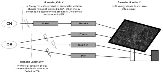 - Standard LCA: In this scenario, the system boundaries of the LCA study remain unchanged compared to conventional LCA and the idea of life cycle thinking. The model accounts for all impacts along the life cycle. Thus, the LCA model is not adjusted to avoid double counting when being integrated into ESA. The reference year is 2018 and the PV modules are produced in China, with all other parts being produced in Germany. This scenario represents realistic production assumptions (see Section 3.1.1).