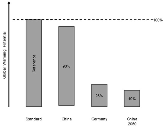 - Production in China 2050 (including avoided double counting and including temporal dimension with the adjustment for future developments): Based on the scenario China, a future production in 2050 is assumed. Changes in the electricity mix are modelled according to the GaBi database [19]. The reference year is 2050. Production sites remain unchanged compared to the scenario China.