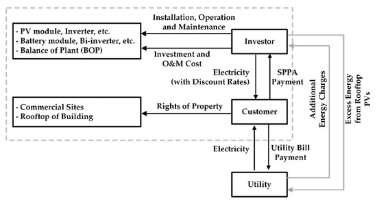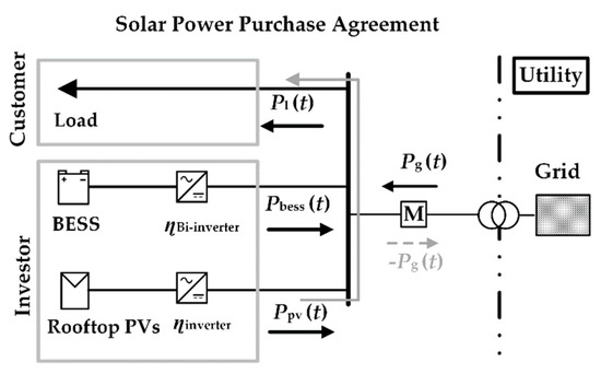 With a significant growth of rooftop photovoltaic systems (PVs) under the behind-the-meter scheme (BTMS), several investors have adopted and developed many business models of rooftop PVs [1,2]. The business models can be categorized into four groups of (1) community-owned solar; (2) solar power purchase agreement (SPPA); (3) solar leasing agreement; and (4) roof rental agreement [3]. The SPPA is one of the most attractive models where the investors act as a third party to directly sell electricity from their rooftop PVs to the customers at a lower rate than the utility’s retail rate [4,5]. The proposed rates of the SPPA are generally divided into the two options of a fixed rate and a discount on the utility’s retail rate [6]. The discount rate option is more practical and convenient for applying with a time-of-use (TOU) tariff with demand charges, which was considered in this paper. The customers under the SPPA can reduce their electricity charges without any performance risk, capital investment, or operating expenses. The challenge for all investors is the competitive discount rates on the TOU tariff with demand charges that can propose to the customers. The benefit to the customers and investors will increase if the reverse power flow injected to the utility’s grid is available.