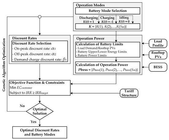Therefore, the discount rates and operation modes were determined for minimizing the total electricity charges of the customers, while remaining the target IRR of the investors, as shown in Figure 3. These discount rates are the maximum discount rates that the investors can propose to the customers and still maintaining an attractive investment. The objective function and constraints are shown in Equations (42)–(46). The decisive variables are on-peak discount rate (α1), off-peak discount rate (α2), demand charge discount rate (β1), and operation modes at time t (K(t)).