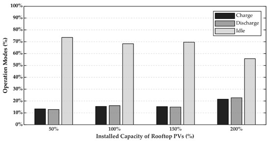 The proposed discount rates, NPV, and IRR for each installed capacity of rooftop PVs were investigated, as shown in Figure 5a,b, respectively. In case that the installed capacity was smaller than 150%, all discount rates were increased when the installed capacity was increased. However, when the installed capacity was larger than 150%, α1 and β1 were approximately constant while α2 was significantly decreased to limit the IRR. For economic analysis, when the installed capacity was increased, the NPV were proportionally increased because of the escalation of revenue. For operation modes, the total operation time of the BESS in the charging and discharging modes for each case were approximately slightly increased when the installed capacity was increased, as shown in Figure 6.