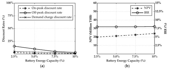 The proposed discount rates, NPV, and IRR for each battery energy capacity, at 50% of battery power capacity, were investigated, as shown in Figure 7a,b, respectively. When the battery energy capacity was increased, all proposed discount rates were significantly decreased to remain the target IRR. For economic analysis, while the IRR remained constant at the target, the NPV were increased because the increase of revenue from the reduction of discount rates were higher than the increase of the total cost. For operation modes, the total operation time of the BESS in the charging and discharging modes for each case were approximately equal and significantly escalated when the battery energy capacity was increased because of the higher energy capacity, as shown in Figure 8.