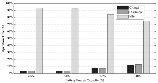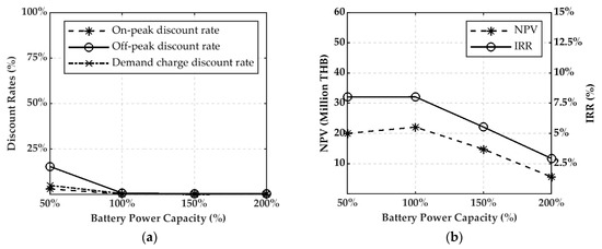 The proposed discount rates, NPV, and IRR for each battery power capacity, at 2.5% of battery energy capacity, were investigated, as shown in Figure 9a,b, respectively. When the battery power capacity was increased, all proposed discount rates were also significantly decreased. For economic analysis, in case that the battery power capacity was higher than 100%, the IRR could not reach to the target although all discount rates were zero because of the high total cost. For operation modes, the total operation time of the BESS in the charging and discharging modes for each case were approximately equal and significantly increased when the battery power capacity was increased because of the higher power capacity, as shown in Figure 10.