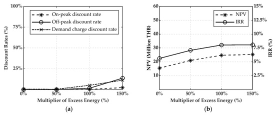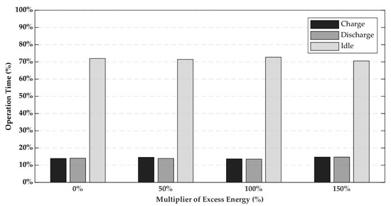 The proposed discount rates, NPV, and IRR for each rate of excess energy were investigated, as shown in Figure 11a,b, respectively. When the rate of excess energy was increased, α1, α2, and β1 were significantly increased. For economic analysis, in case that the rate of excess energy (γ) was lower than 100%, the IRR could not reach to the target although all discount rates were zero because of the low revenue and high total cost. For operation modes, the total operation time of the BESS for each case were approximately equal, as shown in Figure 12.
