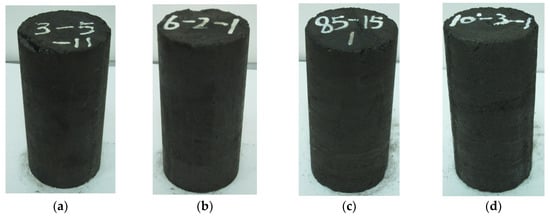 The coal samples used in the experiment were taken from the Ji group coal seam in the Pingdingshan coal mine area, with burial depths of 300 m, 600 m, 850 m, and 1050 m. The four deep coal samples obtained were generated in the same geological period to ensure that the experimental coal samples met the requirements of consistent lithology and different depths as much as possible. Furthermore, in accordance with the recommendations of the International Society for Rock Mechanics (ISRM), the coal samples from different depths were processed into standard cylindrical specimens with dimensions of Φ50 mm × H100 mm. The typical coal samples prepared at four depths are shown in Figure 1.