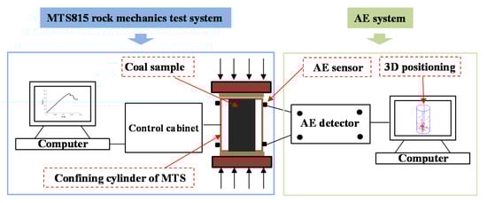 An MTS 815 rock mechanics test system and the AE system at Sichuan University were used as experimental equipment, as shown in Figure 2. The MTS 815 rock mechanics test system is a fully digital computer-controlled system. The axial load is 0–4600 kN, the axial displacement is ±50 mm, and the ranges of the axial and circumferential deformation extensometers are −4.0 to 4.0 mm and −2.5 to 12.5 mm, respectively. This set-up can record the load, stress, and displacement in real time and draw the load–displacement curve synchronously.