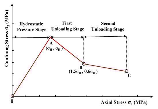 Based on the on-site measured and collected statistical results of the initial in situ stress in the coal seam at different depths in the Pingdingshan coal mine area, the simulation method of σ3 = σH (confining pressure = maximum measured in situ stress) was adopted for the initial stress environment of coal samples at different depths []. According to this, the initial confining pressures of the coal samples at burial depths of 300 m, 600 m, 850 m, and 1050 m in the Pingdingshan coal mine area were 14.2 MPa, 31.3 MPa, 40.7 MPa, and 43.6 MPa, respectively. Referring to the generalization method of the mining stress path by Xie et al. [,], the experimental process was divided into three stages: the hydrostatic pressure stage, the first unloading stage, and the second unloading stage (as shown in Figure 3).