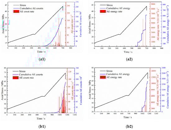 AE signals excited by microfracture events inside coal samples were collected in real time and characterized by AE characteristic parameters such as AE counts, AE events, AE energy, amplitude, duration, and rise time []. By analyzing these AE parameters, the AE characteristics of typical coal samples at different depths under triaxial unloading were studied, which is helpful to further understand the unloading failure characteristics of coal at different depths under mining disturbance.