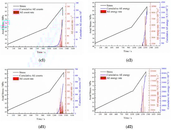 AE temporal characteristic parameter and deformation evolution process of coal samples at different depths: (a1) 300 m (cumulative AE counts and AE count rate), (a2) 300 m (cumulative AE energy and AE energy rate), (b1) 600 m (cumulative AE counts and AE count rate), (b2) 600 m (cumulative AE energy and AE energy rate), (c1) 850 m (cumulative AE counts and AE count rate), (c2) 850 m (cumulative AE energy and AE energy rate), (d1) 1050 m (cumulative AE counts and AE count rate), and (d2) 1050 m (cumulative AE energy and AE energy rate).