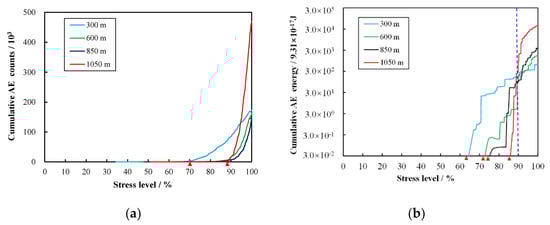 Figure 5 shows how the cumulative AE counts and cumulative AE energy of typical coal samples at different depths vary with respect to the axial stress level. As shown in Figure 5a, the AE counts of the 300-m coal sample begin to increase at an axial stress level of approximately 70%, and the AE count of the 1050-m coal sample is approximately 87%. However, the AE counts of the 1050-m coal sample grow more rapidly, and the cumulative AE counts of the 1050-m coal sample are 2.7 times that of the 300-m coal sample. According to the cumulative AE counts, the AE events in deep coal occur later than those in shallow coal under mining unloading conditions; however, the AE activity level and activity intensity are higher in deep coal.