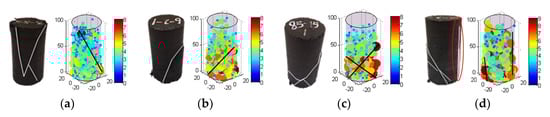 The AE events and energy value at the time of failure of the coal samples at different depths are spatially retrieved in Figure 6. In this figure, each sphere represents an AE event. The diameter and color of the sphere represent the energy value of the AE event. A larger sphere and darker color denote a higher energy value. As shown in Figure 6, the AE activity inside the coal samples is very high. The high-energy AE events are mostly distributed near the macroscopic fracture surface of the coal samples. The spatial distribution of AE events has a good correspondence with the destruction morphology of the coal samples. With the increase in the depth, more macroscopic vertical splitting cracks are produced when the deep coal sample is destroyed (Figure 6d), and the number of high-energy AE events inside the coal sample increases. Moreover, the number of high-energy AE events around the macroscopic fracture surface of the coal sample also increases. The spatial distribution of the AE energy release effectively reflects the rupture information of coal.