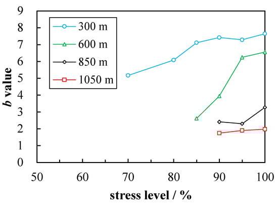 Based on Equation (1), the b value was calculated by fitting the AE amplitude data during the experiment, and the b value evolution characteristics of typical coal samples at different depths under triaxial unloading are shown in Figure 7. Before the peak stress, the b value of the coal samples at all depths increases as the axial stress level increases. This reflects the evolution law that the small-scale microcracks inside the coal sample gradually increase along with the unloading process, which is the result of microcrack propagation inside the coal. In addition, the b value of the coal sample decreases with increasing depth, which shows that the microcrack scale inside deep coal is larger than that inside shallow coal.