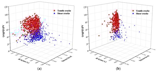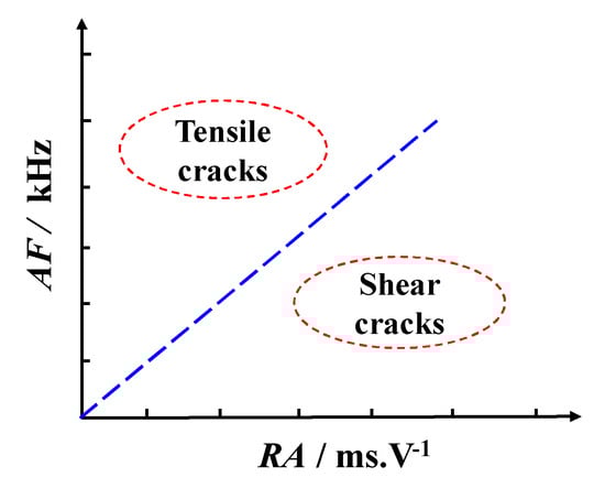 Based on the crack classification method proposed by Ohtsu [], the tensile and shear failure behavior of typical coal samples at different depths under triaxial unloading conditions were studied. Specifically, according to the combination of the four types of AE characteristic parameters of rise time, amplitude, AE counts, and duration, the RA value and AF value are defined as follows: