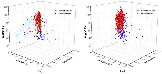 In general, the initiation of tensile cracks in rock materials mostly has high AF values and low RA values, whereas shear cracks have the characteristics of high RA values and low AF values. As shown in Figure 8, based on the studies of Liu [], Yao [], Ohtsu [], and He [], RA–AF correlation analysis was used to classify the cracking mode of the coal samples (AF:RA = 1). Accordingly, the classification results of the cracking mode during triaxial unloading of typical coal samples at different depths are shown in Figure 9. It should be noted that, since the AE signal in the first unloading stage of the coal samples at four depths was not detected, Figure 9 shows the tensile and shear cracks in the second unloading stage. Figure 9a–d intuitively show that, with the increase in depth, the axial stress level where the tensile and shear cracks begin to emerge increases, and the tensile and shear cracks tend to be more concentrated in high-axial-stress areas. In addition, compared to shallow coal samples, deep coal samples have a higher number of tensile cracks with high AF values and a lower number of shear cracks with high RA values, which shows that, with increasing depth, the tensile cracks in the coal gradually occupy a dominant position in quantity. The above analysis qualitatively reflects the differences in the tensile and shear crack evolution characteristics of deep and shallow coal under triaxial unloading.