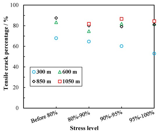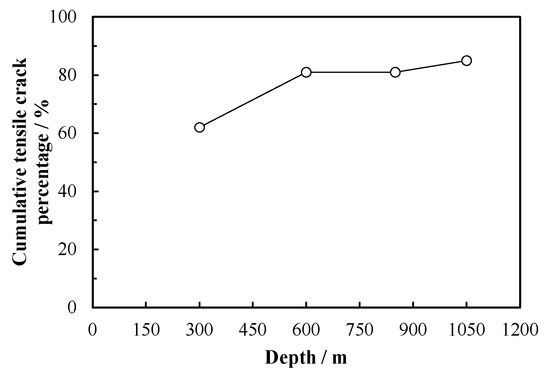 Figure 10 shows the tensile crack percentage of typical coal samples at specific depths during different stress stages. Figure 11 shows the cumulative tensile crack percentage in the overall triaxial unloading process of typical coal samples at different depths. As shown in Figure 10, when the depth is constant, as the axial stress level increases, the tensile crack percentage of the 300-m coal sample shows a decreasing trend (the decrease is 14.97%), the 600-m and 850-m coal samples decrease first and then increase, and the 1050-m coal sample generally increases. As the depth increases, the tensile crack percentage of the coal sample in each stress stage increases, and, in the stress stage (95–100%) near the coal failure, the difference between the tensile crack percentage of the deep and shallow coal samples is significantly higher than that in the other stress stages. In addition, the cumulative tensile crack percentage in the overall triaxial unloading process of the coal sample shows a trend of increasing with increasing depth; the cumulative tensile crack percentage is 61.60% for the 300-m coal sample and 85.05% for the 1050-m coal sample, which is an increase of approximately 23.45%, as shown in Figure 11. The above results show that there are significant differences in the crack evolution characteristics during the triaxial unloading of coal at different depths. A greater depth results in more complete tensile crack propagation near the unloading failure of coal.