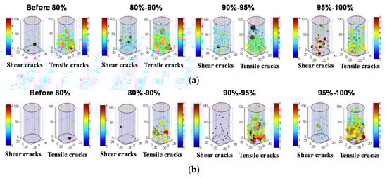The spatial–temporal evolution of the tensile and shear cracks in the 600-m and 850-m coal samples has similar characteristics. Crack development is dominated by tensile cracks during the initial stage (before axial stress level 80%), and, as the unloading continues, the shear crack percentage increases during the 80–90% stress stage (the percentage is still below 25%) and decreases during the 90–100% stress stage. The nucleation phenomenon of tensile cracks appears at the bottom of the coal sample and that of the 850-m coal sample is more obvious than that of the 600-m coal sample (Figure 12b,c). This finding shows that, with the increase in depth, the 600-m and 850-m coal samples gradually change to exhibit tensile failure behavior caused by the propagation of tensile cracks.