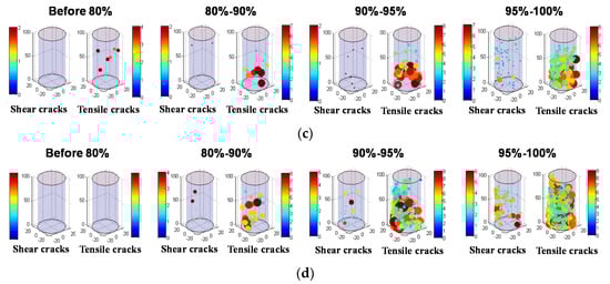 For the 300-m coal sample, in the initial stage of crack development (before 80% axial stress level), the number of tensile cracks formed is higher than the number of shear cracks formed. As the unloading progresses, the percentage of tensile cracks decreases continuously (80–90%). During the stress stage near coal failure (95–100%), the percentages of tensile cracks and shear cracks are similar (the tensile crack percentage is 52.94%, whereas the shear crack percentage is 47.06%), and no nucleation of tensile or shear cracks is observed inside the coal sample (as shown in Figure 12a), indicating that the failure behavior of the 300-m coal sample is controlled jointly by tensile and shear cracks and, finally, tensile–shear composite failure occurs.