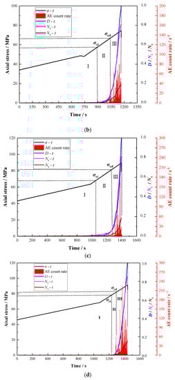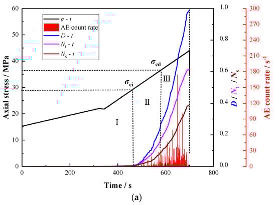 Crack initiation stress and crack damage stress are the two most commonly used thresholds for describing the process of rock damage. The crack initiation stress σci corresponds to when the cracks inside the rock initiate and grow stably, whereas the crack damage stress σcd corresponds to when the cracks start to grow unstably with the increase in stress []. Crack initiation stress σci and damage stress σcd can be determined by the crack volumetric strain method and AE method, and the study of Martin and Cai et al. showed that these two methods have a good correspondence [,]. At present, many scholars determine the crack initiation stress σci and the crack damage stress σcd by using the AE method [].