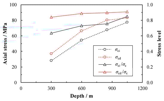 Based on the AE method proposed by Martin and Cai et al. [,], as shown in Figure 13, when the damage variable D starts to increase slowly from 0 and the AE count rate starts to increase slightly, the coal sample enters damage stage II, and the corresponding axial stress is σci. When the damage variable D begins to increase rapidly and the AE count rate begins to increase dramatically, the coal sample enters damage stage III, and the corresponding axial stress is σcd. Accordingly, the crack initiation stress σci and crack damage stress σcd of coal samples at different depths are obtained as shown in Figure 14. The crack initiation stress level (σci/σc) of coal at different depths ranges from 0.63 to 0.84, and the crack damage stress level (σcd/σc) ranges from 0.83 to 0.90. Previous work indicated that the crack initiation stress level (σci/σc) ranged from 0.3–0.7 for different types of rocks []. Xue et al. [] analyzed the published results of igneous, metamorphic, and sedimentary rocks and showed that the crack damage stress level (σcd/σc) ranged from 0.73–0.85. In addition, Tang et al. [] found that the initial stress level and damage stress level of coal under triaxial compression were 74.53% and 89.84%, respectively, which are very close to our results.