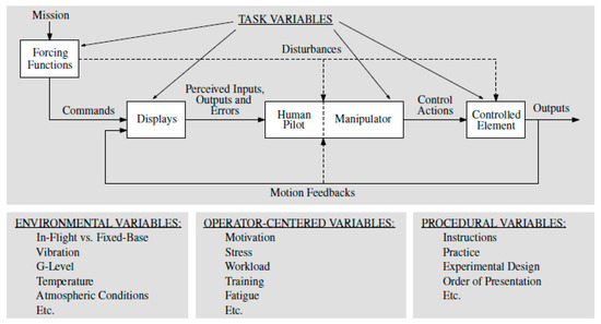 Compensatory feedback control was carefully researched for controlling activities, where the human factor could perceive only one controlled variable and other influencing parameters were unpredictable. Much of our current knowledge originates from research of human dynamics during compensation control tasks with one feedback loop [6,9]; this investigation also showed the complexity of studying the human control process and the ability to adapt to various tasks, namely environmental, control, and procedural variables, as they are summarized in the comprehensive overview proposed in Reference [9].