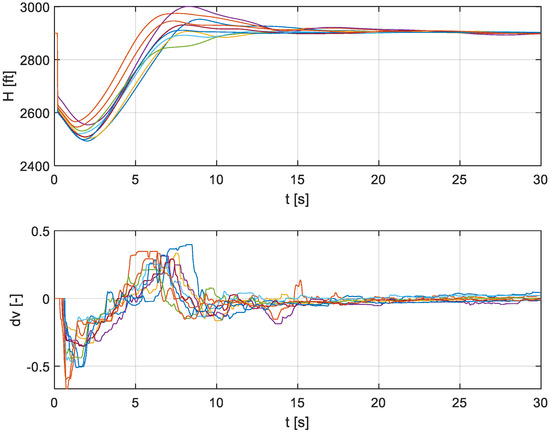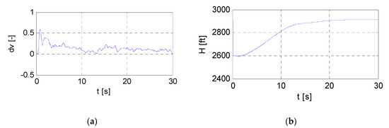 The repeated measurements with the same pilots under the same or similar conditions, using the aforementioned flight simulators, were performed. Data representing mainly altitude, H (perceived input signal), and stick (joystick) deflection, dv (pilot’s control action), were acquired as a result of the measurement for the following data processing and parameters identification of the pilot’s behavioral model. An example of the measured data is in Figure 3.