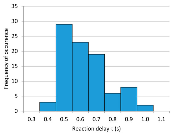 The first and, at the same time, one of the most important parameters is the reaction delay, τ. The evaluation of this parameter is included in the histogram in Figure 5. The most frequently occurring value of this parameter reaches about 0.5 s, a level typical of such human (pilot) activities [26].