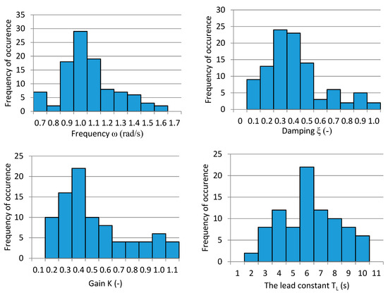 Figure 5 and Figure 6 present an evaluation of the individual parameters of the pilot’s behavior Model (3) for the aforementioned group of military pilots. All of these histograms exploit the statistical dataset, including approximately 100 values (10 test measurements per 10 pilots). The outliers are neglected. The distribution of the individual parameters is, in most cases, similar to the log-normal distribution, corresponding to the expectations, as the log-normal distribution of probability is often connected with the human factor.