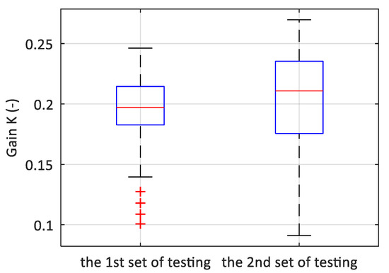 The first parameter to be evaluated is the gain, K. This parameter describes the habits practiced by the pilots when executing a control intervention (action), and, together with the control constants, TL and TI, it defines the resulting response dynamics. The graph—Figure 7 clearly indicates that, in the second set of measurements, the interval of values in which this parameter may be present was extended. At the same time, however, the median was shifted upward, to increase the gain value from 0.19 to 0.21. This fact reflects a rise in the control process speed, meaning that the pilots generally achieved the desired value more quickly.