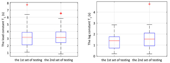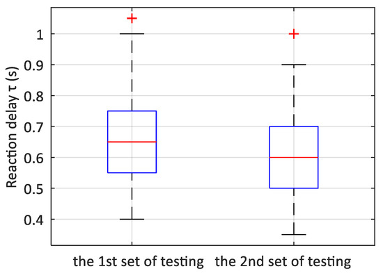 The second parameter subjected to evaluation is the reaction delay, τ, in which a marked decrease can be observed, see Figure 8. The median value moved up to 0.05 s between the first and the second measurement sets; such a change is satisfactory, considering that the character of this parameter as the reaction delay relates to the registration time and the subsequent processing of the visual information. Reducing this time has a positive impact on the eventual regulatory process.