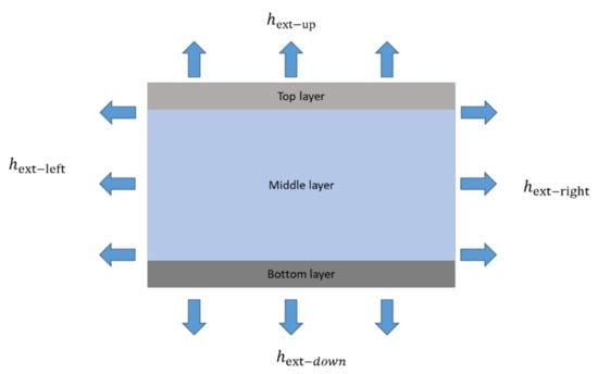 The commercial code ANSYS Fluent is used; all source terms of the governing equations S, thermal conductivity K, heat transfer convection coefficient, are calculated based on the study of electrothermal film [13]. Both the proton exchange membrane (PEM) and electrothermal film (ETF) of the volume power density are 1 × 107 W/m3, the PEM thermal conductivity K is 0.18 . The detailed calculation procedure about thermal power density and thermal conductivity is shown in Appendix B. The heat transfer convection coefficient is shown in Figure 1, where the , , , represent the heat transfer convection coefficient in top side, bottom side, left sides and right sides of the PEMFC stack, respectively. The corresponding values are 7.16 , 3.58 , 4.89 , 4.89 respectively. The detailed calculation process of the heat transfer convection coefficients are shown in Appendix A.