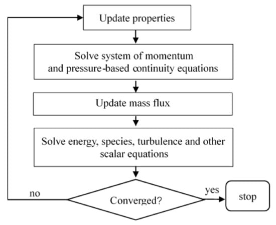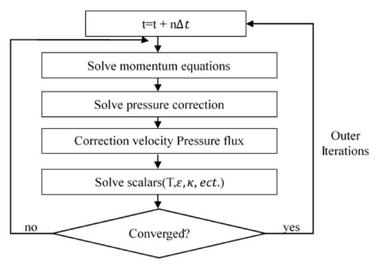 A pressure-based solver is adopted, which employs an algorithm belonging to the general method category, called the projection method [33]. The detailed solving process is shown in Figure 2.