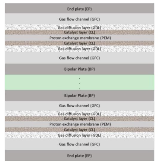 This paper establishes a two-dimensional PEMFC stack, which consists of 40 single PEMFCs connected in series. Each PEMFC consists of a cathode/anode bipolar plate (BP), a cathode/anode gas flow channel (GFC), a cathode/anode gas diffusion layer (GDL), a cathode/anode catalyst layer (CL), and a proton exchange membrane (PEM). The melting process of the ice is assumed to occur in the boundary area between the cathode/anode GFC and the GDL. The model structure of the PEMFC stack is shown in Figure 4, where the structure dimensions and material parameters are given in Table 1.