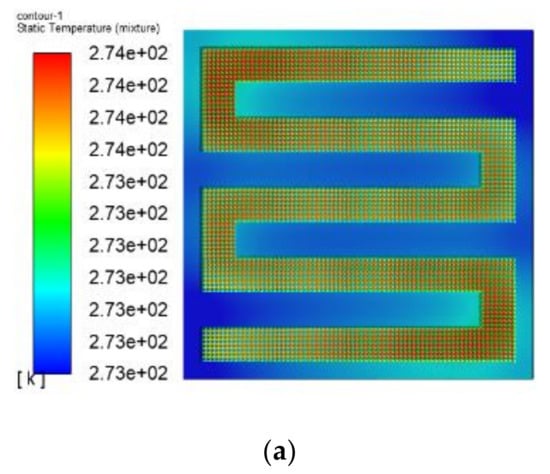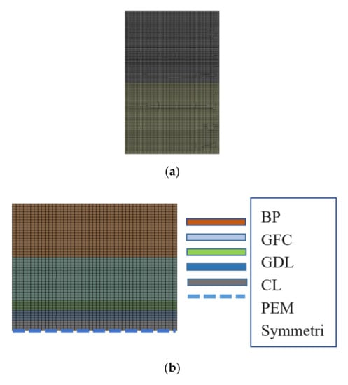 Due to an existing large number of meshing points, Figure 5a only shows the computational mesh of two single PEMFCs, Figure 5b shows the half of one single fuel cell meshing points. As a sufficient quantity of mesh is conducive to improve the calculation accuracy, several kinds of meshing size have been designed, which are 200 μm, 100 μm, 50 μm, 40 μm, 35 μm, 30 μm, 10 μm, respectively. We took ice melting time as the research object, and finally found that the meshing sizes of 200 μm, 100 μm, and 50 μm were quite different; the minimum difference between them reached up to 20%, while the results for 40 μm, 35 μm, 30 μm, and 10 μm were almost the same. We finally chose a meshing edge length of 40 μm for improving calculation efficiency. In order to simplify the model and reduce the calculation time, 1/2 model is adopted and a geometric/symmetric condition is applied at the bottom surface of the PEMFC stack. On the other hand, convection heat transfer coefficient is used to the all external surfaces of the PEMFC stack, and the detailed boundary conditions are represented in Appendix A.