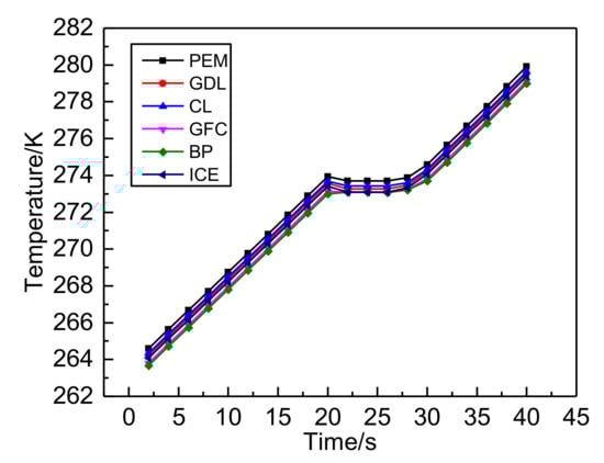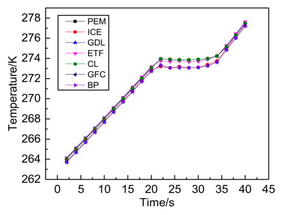 The average temperature distribution of the material center of each layer in the PEMFC stack at different times is given by Figure 6. It can be seen that the temperature of each layer gradually increases with time, the proton exchange membrane (PEM) temperature is the highest, and the temperature of the catalyst layer (CL), gas diffusion layer (GDL), ICE, and gas flow channel (GFC) layers is relatively lower, and the temperature of the bipolar plate (BP) layer is the lowest. It is also apparent that when the temperature rises to 273 K, the ice starts to melt and the complete melting time lasts for about 12 s. Due to the fact that ice needs to absorb heat during the melting process, the temperature curvature of each layer is almost horizontal from the beginning to the end. After the ice is completely melted, the temperature of each layer continues to rise.