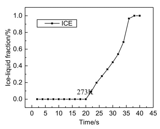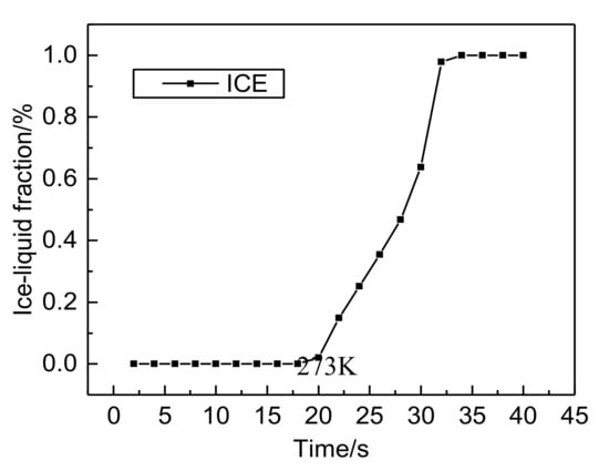 The liquid fraction distribution at the center of the ICE layer in the PEMFC stack at different times is given by Figure 7, what can be seen from the figure is the fact that the liquid fraction is 0 before the temperature reaches 273 K. When the temperature arrives at 273 K and the time is 20 s, the ice starts to melt, and as the heating time increases, the liquid fraction of ice increases gradually. When it is heated to 32.5 s, the liquid fraction is 1, which means the ice is completely melted.