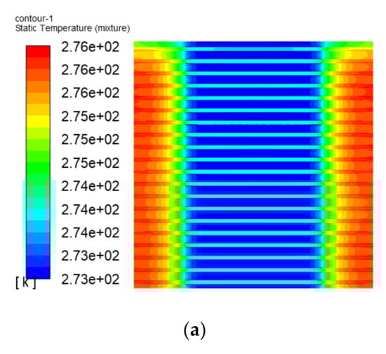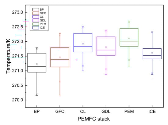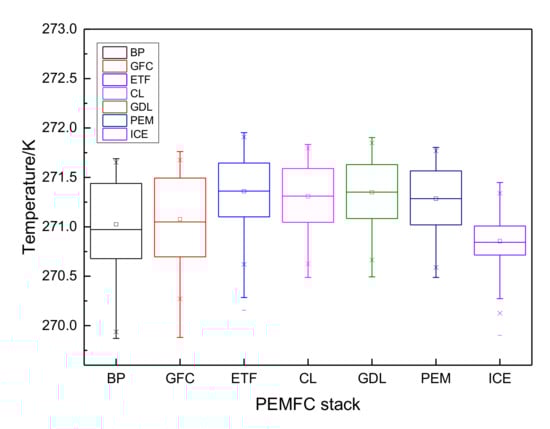 In order to observe the overall temperature distribution of the PEMFC Stack, the 16th second is selected to observe the temperature distribution in the vertical direction. Figure 15 is the temperature distribution curve of each layer of the PEMFC stack before the overall temperature reaches the melting point. The horizontal ordinate is the distance in the vertical direction of the PEMFC stack, including the negative/positive GFC, the ICE, the ETF, the GDL, the CL, the PEM, and the BP of the fuel cell, and the vertical coordinate is the temperature distribution in the vertical direction; the temperature differences between the layers in the PEMFC stack can be clearly seen. Among them, the average temperature of the BP is the lowest, only 270.05 K, the ETF is the highest, 271.3 K, and the GFC is 271.1 K.