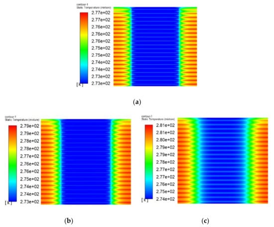 Temperature contours of the PEMFC stack at different times: (a) t = 24 s, (b) t = 28 s, (c) t = 32 s.