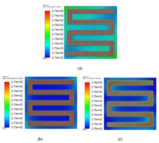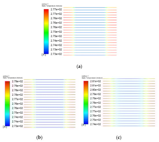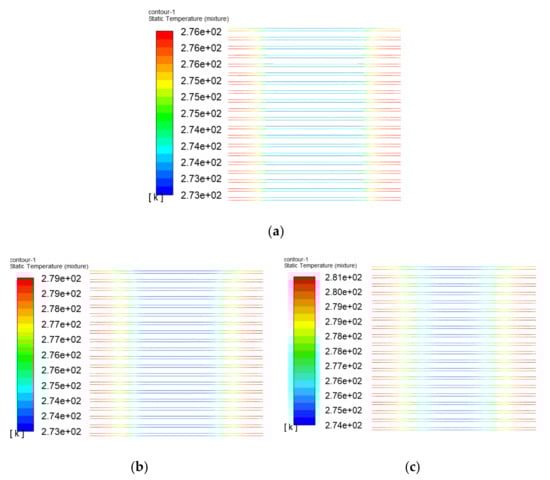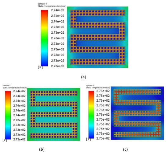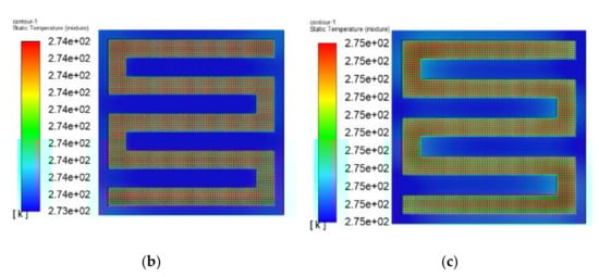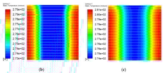 The temperature distribution of the PEMFC stack at different times (24 s, 32 s, 36 s) is shown in Figure 16. The ice is located at the middle of the blue area. Because there is no ice on the edges, the temperature is higher. However, the temperature distribution of the ice inside is still lower, and the temperature reaches the melting point of 273 K at 24 s. As the heating time increases, the temperature continues to rise and the ice continues to melt. Figure 17 shows the temperature distribution of ETF at different times (24 s, 32 s, 36 s), from which it can be seen clearly that the temperature gradually increases as computing time extends.