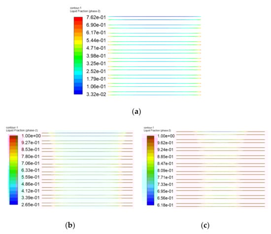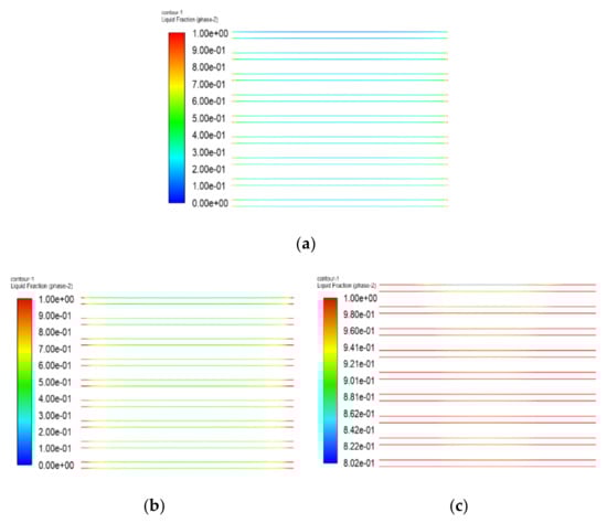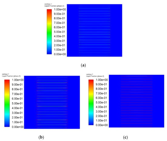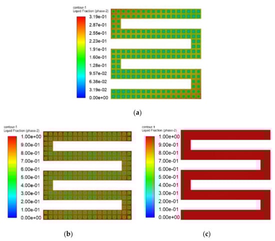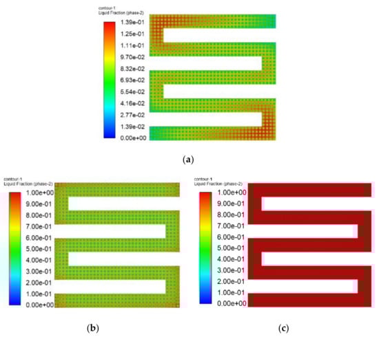 Liquid fraction contours of ice at different times; (a) t = 24 s, (b) t = 32 s, (c) t = 36 s.